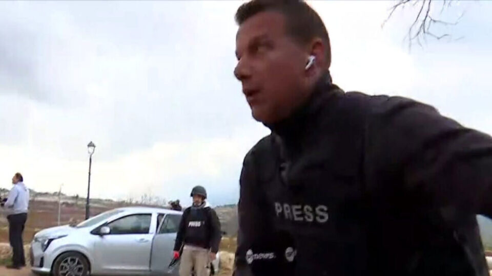 Ο δημοσιογράφος καλούσε τους συναδέλφους του στην κάμερα και τον ήχο, Φώτη Πάντο και Παναγιώτα Δερβιτσιώτη να καθίσουν κάτω για να προστατευθούν.