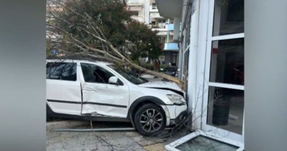 Το όχημα προτού προσκρούσει πάνω στην τζαμαρία, καβάλησε ένα πεζοδρόμιο, ξερίζωσε ένα δέντρο και ξήλωσε δύο πινακίδες.