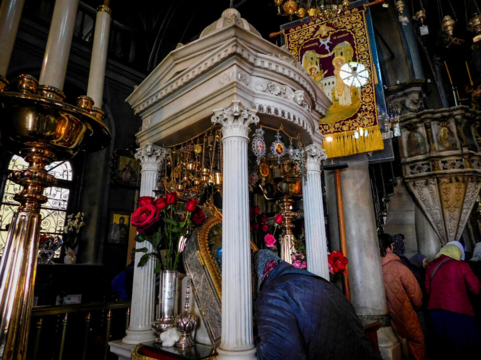Κατά την εκκλησιαστική παράδοση, η Παναγία εκοιμήθη στο σπίτι του Ευαγγελιστή Ιωάννη, όπου διέμενε η μητέρα του Θεανθρώπου. Αφού της έκλεισαν τα μάτια, οι Απόστολοι μετέφεραν το νεκροκρέβατό της στον κήπο της Γεθσημανής, όπου και την έθαψαν.