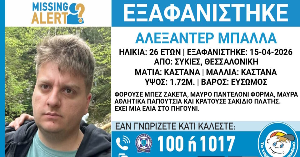 Συναγερμός στις Συκιές Θεσσαλονίκης για την εξαφάνιση ενός 26χρονου. Όπως ανακοίνωσε το «Χαμόγελο του Παιδιού», ο Αλεξάντερ Μπάλλα αγνοείται από τις 15 Απριλίου 2026.