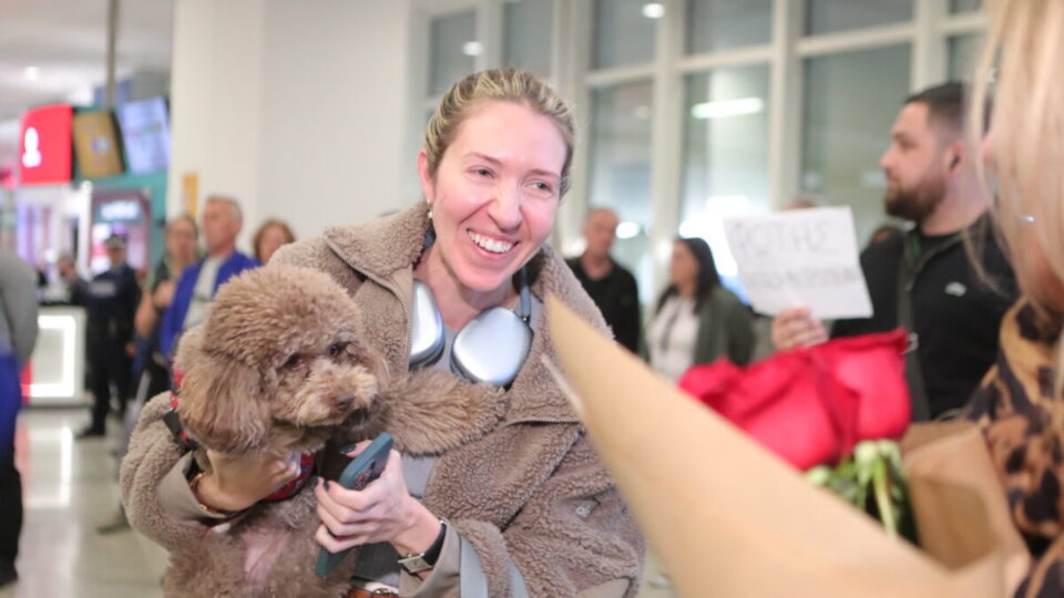 Ελληνίδα επιστρέφει από τη Μέση Ανατολή, αγκαλιά με τον τετράποδο φίλο της, στο πλαίσιο επιχείρησης επαναπατρισμού (Πηγή φωτογραφίας: ΣΩΤΗΡΗΣ ΔΗΜΗΤΡΟΠΟΥΛΟΣ / EUROKINISSI)