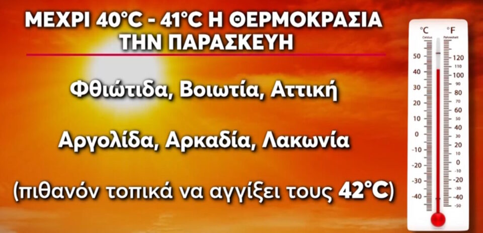Σε όλη την υπόλοιπη χώρα η θερμοκρασία θα κυμανθεί από 40 έως 41 βαθμούς Κελσίου.