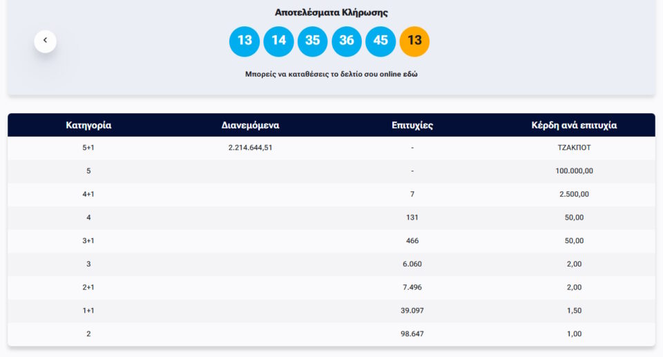 Κλήρωση Τζόκερ σήμερα 21/09/2025 και τα λεφτά ήταν… πολλά! Στην κλήρωση Τζόκερ ΟΠΑΠ, σήμερα Κυριακή (αριθμός κλήρωσης 2965), οι τυχεροί αριθμοί ήταν οι: 45, 36, 35, 14, 13 και Τζόκερ το 13.