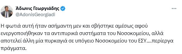 «Η φωτιά αυτή ήταν ασήμαντη μεν και σβήστηκε αμέσως αφού ενεργοποιήθηκαν τα αντιπυρικά συστήματα του Νοσοκομείου, αλλά αποτελεί άλλη μία πυρκαγιά σε υπόγειο Νοσοκομείου του ΕΣΥ…περίεργα πράγματα», ανέφερε χαρακτηριστικά.